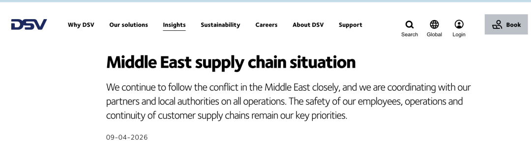 货代巨头DSV则于今日(4月9日)公布了中东地区运营的最新举措及应急预案,全力应对当前的挑战。