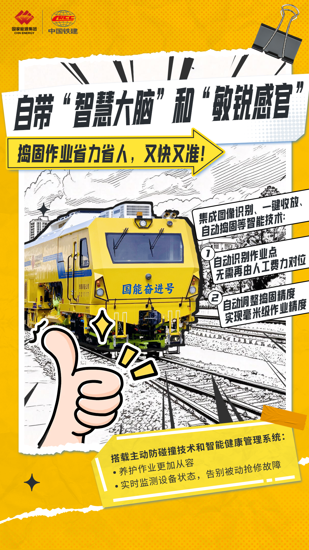 不仅动力先进,这台设备还像“开了挂”一样智能,相当于给传统的捣固车装上了“智慧大脑”和“敏锐感官”。它集成了图像识别、一键收放、自动捣固等智能技术,不用人工精准对位,设备能自动识别作业点、自动调整捣固精度,作业精度达毫米级,捣固作业又快又准,大大降低了对人工经验的依赖。
