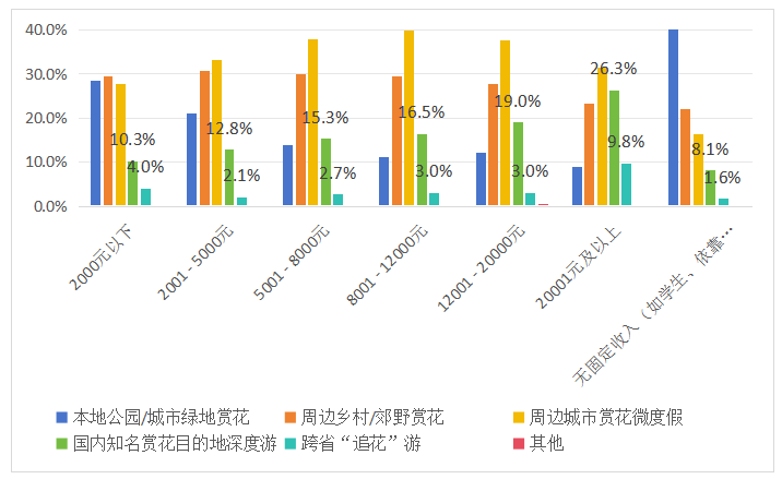 赏花消费结构持续优化。赏花游消费能级持续提升,正在从低门槛看景向高品质停留转变。专项调研显示,2025年赏花游中人均消费500元及以下的占比为45.8%,到2026年降至44.2%;与之对应,501—1000元区间占比则由39.9%上升至43.6%,提高了3.7个百分点。拉动客单价上升的,不是单纯扩大花景规模,而是围绕花景构建更完整的体验链条。重庆多地通过花田火锅、乡村民宿、空中赏花等新场景延伸“赏花经济”消费链条。在江津区蔡家镇猫山樱博园,7000亩樱花竞相绽放,今年2月开园以来已接待游客近15万人次,销售收入同比增长10%。只要停留体验足够丰富,花景就能够转化为更高质量的消费场景。赏花游出游半径明显拉长。赏花游由城市内部延伸至近郊和周边城市,乃至远程目的地。专项调研显示,在赏花目的地空间选择上,“周边城市赏花微度假”以36.6%的比例居首,“周边乡村/郊野赏花”占29.6%,次之,明显高于“本地公园/城市绿地赏花”的15.6%。“国内知名赏花目的地深度游”占15.3%,表明长线市场也在稳定增长当中。其中,高收入群体的长线化特征更加突出,月收入20001元及以上群体中,选择“国内知名赏花目的地深度游”和“跨省‘追花’游”的比例分别达到26.3%和9.8%。图1 不同收入群体的赏花出游方式偏好