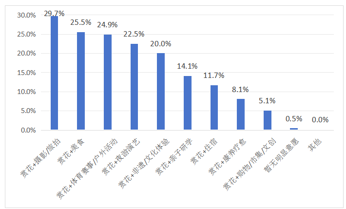 情绪疗愈和社交传播成为主要动机。专项调研显示,42.2%的受访者将“拍照出片、记录分享”置于赏花游动机首位,高于“欣赏花卉美景、感受自然季节变化”(41.8%)和“参加赏花节庆、感受热闹氛围”(27.4%)。这意味着,决定游客停留时长和消费转化的,已不只是能否看到花,更在于能否在场景中完成情绪疗愈、身份表达和社交传播。谁能够提供更高的出片率、更稳定的氛围感和更易触发分享的话题点,谁就更容易在社交媒体时代形成二次扩散。2026年樱花节期间,无锡鼋头渚通过增加樱花品种、延展湖岸游线,并叠加AR漫游、光影音乐会、主题游船和夜樱演艺,将传统白天赏樱升级为全天候情绪消费场,游客停留时长明显延长,二次消费比重持续提高。多元化、多层次市场特征日益明显。赏花游正在摆脱“只是年轻人拍照打卡”的单一印象,形成覆盖青年、中年到银发人群的广谱市场。不同年龄客群的需求逻辑并不相同,18—24岁受访者更偏好妆造打卡、时尚专场和数字化表达,25—45岁群体则更关注夜游演艺、组合产品、联票套餐以及天气和客流预警。收入水平同样影响赏花行为,无固定收入群体以“本地公园/城市绿地赏花”为主,占比达到52.0%;2001—5000元群体已明显向周边乡村赏花和周边城市微度假扩展;8001—12000元群体中,“周边城市赏花微度假”占比进一步升至36.0%;高收入人群则更倾向于深度游和跨省“追花”。赏花目的地继续呈现多元化发展,覆盖全国各地。平台数据显示,2026年春季赏花游十大热门目的地分别是:武汉(东湖樱花园/武汉大学·樱花)、婺源(江岭/ 篁岭·油菜花)、无锡(鼋头渚·樱花)、贵阳(贵安万亩樱花园·樱花)、洛阳(王城公园·牡丹)、平谷(多地·桃花)、昆明(教场北路·蓝花楹)、林芝(波密·桃花)、曲靖(罗平·油菜花)、上海(顾村公园·樱花)。“赏花+”玩法更受游客欢迎。对游客“赏花+”复合型消费产品购买意愿的调查显示,最受欢迎的是“赏花+摄影/旅拍”,占比29.7%;其次是美食、体育赛事/户外活动、夜游演艺和非遗/文化体验。这表明,游客愿意为花景买单,但更愿意为花景之上的内容和体验支付溢价。湖北花博汇将郁金香花海与花神巡游、飞花令、非遗火秀铁花等内容结合,形成“日夜双景+沉浸赏花”的体验模式;广州海珠湿地以宫粉紫荆花道为基础举办花朝节,嵌入十二花神和国风NPC互动,将自然湿地转化为国风沉浸场域。未来决定“赏花+”产业能否发展壮大的关键,不在于简单做加法,而在于不同场景之间能否形成完整的体验闭环和消费闭环。从现有案例看,樱花、油菜花和牡丹已经分别形成了城市节会型、乡村廊道型和文化IP型三类较为成熟的开发模式。对目的地而言,真正需要思考的不是种什么花最热,而是围绕何种花景资源形成何种产品逻辑和消费结构。交文旅深度融合提升赏花体验。当游客越来越重视出行效率、游览组织和综合体验,赏花经济也要从“看花”转向“赏花+交通+消费”。今年春季,多地围绕花事活动同步优化交通接驳和文旅场景。洛阳在牡丹文化节期间强化节会活动与城市消费联动,打造沉浸式文旅新场景;长沙推出“地铁+公交”春游专线,直达赏樱点和热门打卡地,减少换乘成本;北京依托S2线“开往春天的列车”,把花海景观、长城游览和周边休闲资源串联起来。交通不再只是配套保障,而是赏花产品的重要组成部分。通过专线接驳、轨道联动和主题线路建设等方式,让游客进得来、游得顺、留得下,既提升了赏花便利度和参与感,也带动了沿线餐饮、文创、休闲等消费增长。农文旅融合提升综合效益。乡村是赏花游的重要场景。赏花游高质量发展的关键,不在于花期带来多少短时客流,而在于能否将流量转化为乡村长期收益。江西婺源篁岭景区较为完整地展示了“农文旅”融合路径:围绕油菜花开发精油、花茶、菜籽油等深加工产品,在游览沿线布局沉浸式徽州农耕市集、古法榨油体验和高品质乡村民宿,推动游客消费从门票和观景延伸到农产品销售、手作体验、餐饮和住宿等本地产业环节。如果说花海负责把游客带到乡村,那么花食、花饮、花材加工、农耕体验和乡村住宿等业态才是价值沉淀的关键。只有推动多元业态协同发展,才能让赏花经济从季节性热闹走向可持续增收。体旅融合丰富赏花业态。赏花游进一步由静态看花转向动态参与,从季节性观景活动转向更契合健康生活方式的运动休闲。专项调查显示,对“花田徒步、骑行等运动体验”表现出浓厚兴趣的比例达到27.4%,愿意为“赏花+体育赛事/户外活动”付费的受访者占24.9%。武汉“樱花马拉松”叠加体育赛事与赏花资源,吸引了来自全球69个国家和地区的3万名跑者;建德围绕油菜花海布局骑行道、赛道和花田瑜伽、冥想营等活动,成功吸引了长三角户外运动和康养客群,让赏花游从静态观赏转向可停留、可复游、可组织社群的生活方式产品。科技创新拓展赏花消费边界。随着数字技术和低空经济加速进入文旅场景,赏花游的观赏方式正在被重新定义,游客不再只在平面空间中看花,而是可以在数字叠加、夜间演艺和空中视角中重新“看花”。依托低空经济产业基础,黄埔探索以无人驾驶载人航空器和低空航线提供空中花海观景体验,将自然观赏与前沿科技直接耦合。这类产品仍处于探索阶段,但其启示在于,赏花游的高价值增