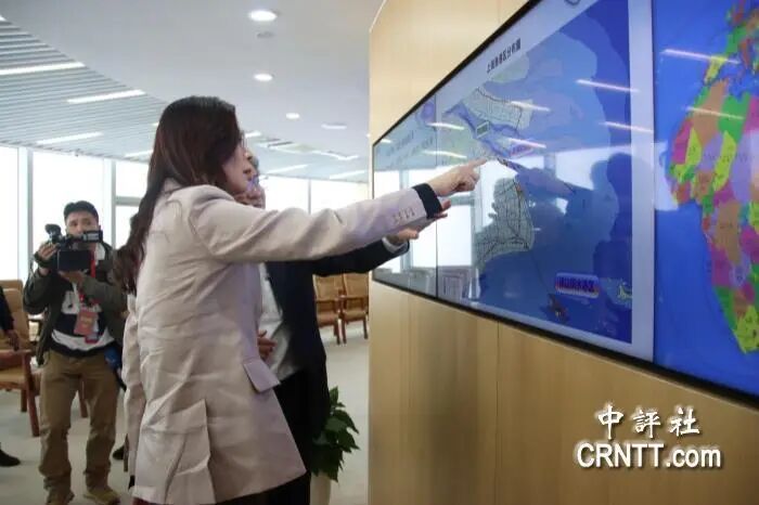 郑丽文在洋山港停留了一个小时有余。其间,她认真聆听了洋山港发展情况,也不时同港区工作人员交流,还细致查看了港区地图。
