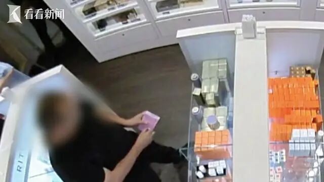 邓某骗过防盗警报的手段也被监控捕捉到了,化妆品的包装上通常有防盗标签,邓某会偷偷把标签撕掉,防止门口的警报器响起。