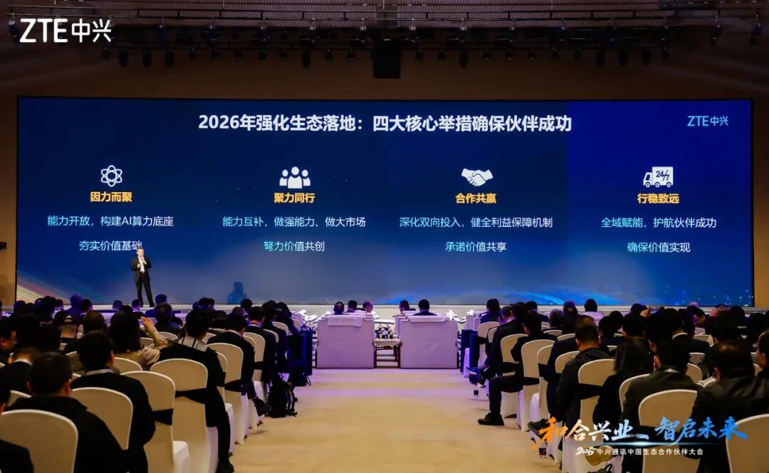针对 2026 年生态发展重点,王翔向合作伙伴明确了核心方向:围绕 “开能力、强合作、共利益、优赋能” 四大核心举措,持续深化与生态伙伴的全方位合作。其中,“开能力” 聚焦核心能力层、基础设施层、能力平台层、应用层、终端层,全面开源开放核心能力,依托架构级协同优化优势,提升系统兼容性与性能,与伙伴共建开放、高效的 AI 算力底座;“强合作” 注重以客户为中心,整合产业链的优质生态资源,与伙伴能力互补,加强与伙伴在“技术-市场”的双向联动,做强AI全栈全场景能力,深耕“6大重点行业+30 个垂直子行业+240个细分场景”市场;“共利益” 即深化双向投入,健全利益保障机制,打造更多元的合作模式,共享更大的商机资源池,提供更多的利益空间,优化更好的合作机制;“优赋能” 则围绕技术、营销、培训、数字化服务四大维度,为伙伴提供系统性的全域赋能,助力伙伴提升核心能力与市场竞争力,同时全面升级一站式数字化服务体系,基于Co-Claw ,为伙伴提供更 “智”“惠” 的智能助手,全面向市场释放 “中兴+伙伴” 的协同合力。