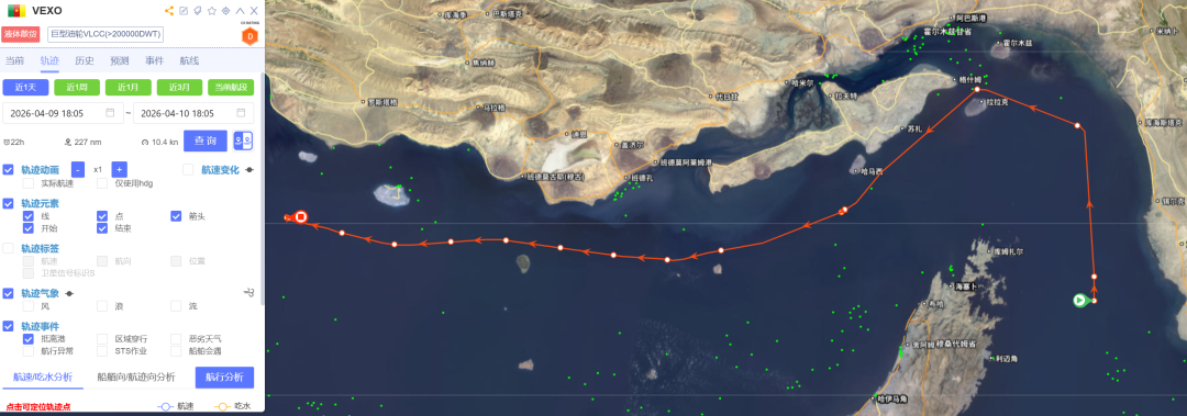 中远海科旗下船视宝向《海运圈聚焦》提供的数据显示,4月9日下午,“VEXO”轮(载重吨309,497吨,建于2000年)自富查伊拉以南海域启程,进入霍尔木兹海峡航道,并于4月10日凌晨顺利抵达波斯湾水域。目前,该轮AIS目的地显示为“To order”,反映出市场在高度不确定环境下,货盘指向仍存弹性。