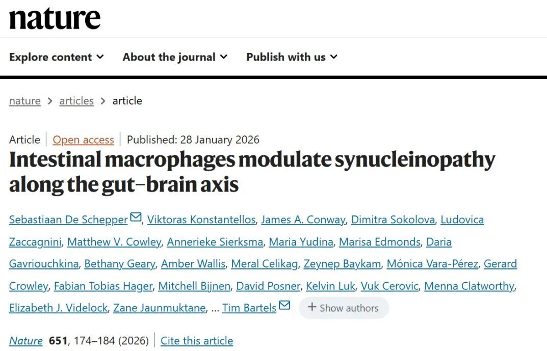 2026年1月28日,《自然》(Nature)杂志发表了一项来自英国伦敦大学学院等机构的研究。研究发现,肠道中的一类免疫细胞——肌层巨噬细胞,是启动这一传播过程的关键。这些细胞吞噬致病蛋白后会激活肠道T细胞,后者可迁移至大脑加剧神经损伤;而清除这些巨噬细胞,能显著阻断病理传播、改善运动功能[2]。