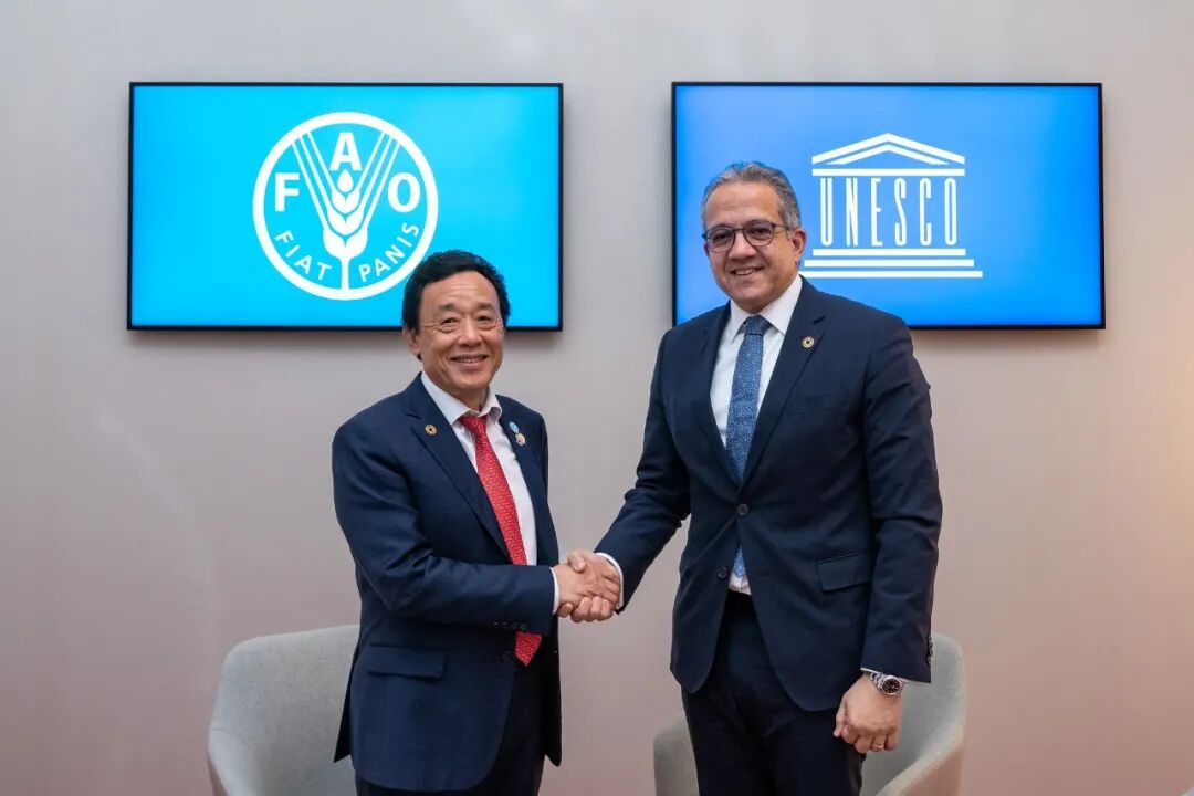 屈总干事会见联合国教科文组织总干事埃纳尼。©粮农组织