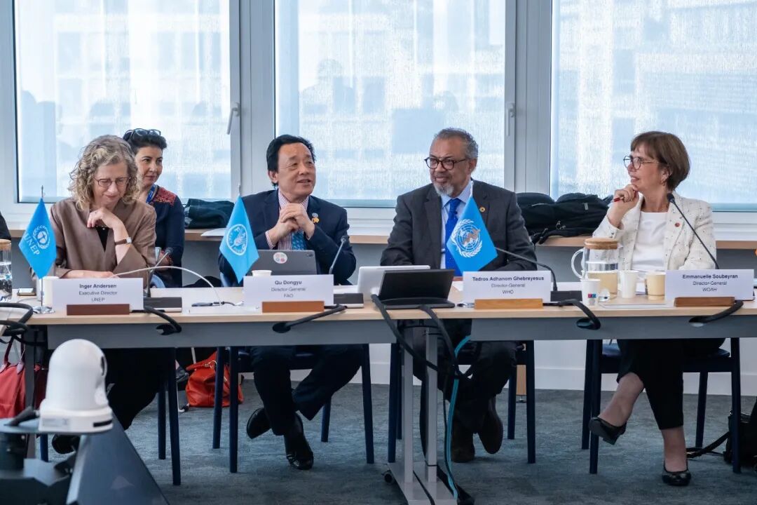 会后,粮农组织卸任四方合作机制轮值主席职务并向世卫组织交接,屈总干事全面回顾了粮农组织任内推动机制从“议而不决”迈向“行胜于言”的进展,并提出下一阶段三大行动方向:一是构建国家层面体系化、规模化推进《联合行动计划》的实施路径;二是依托基于实证、论证充分的联合方案,撬动可持续投资;三是提升政治层面关注度与宣导效果,确保“同一个健康”稳居全球议程核心位置。与会三家机构领导人对粮农组织过去一年来领导四方合作机制所取得的成果表示衷心感谢,表示将在此基础上再接再厉,推动“同一个健康”议程在全球范围内取得更多务实成果。