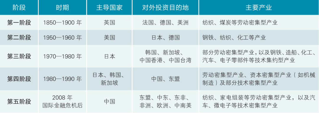从国际范围看,对外直接投资的历史演进可划分为五个阶段,详见表1所示。自第四阶段(20世纪80-90年代)开始,日本、韩国、新加坡等国家的劳动密集型、资本密集型(以机械制造为主)及部分技术密集型产业逐步向中国及东南亚地区转移。在第五阶段,中国制造业实现快速发展。2008年国际金融危机后,受劳动力、土地等要素成本上升的影响,中国部分劳动密集型产业开始向东盟国家转移,与此同时,一些技术密集型产业也逐渐向欧美发达国家布局。