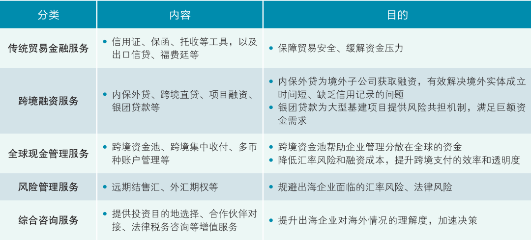 此外,不同规模、行业和发展阶段的出海企业,其金融需求也存在明显差异。大型跨国企业通常需要全球统一的授信安排、复杂的资金池管理以及多币种风险管理工具,而中小企业则更注重融资渠道的便利性、成本可控与手续简化。银行有必要根据企业类型和实际经营特点,提供差异化的金融解决方案。目前,中国企业“出海”仍处于持续深化阶段,国内银行业在支持企业国际化经营方面已形成一系列服务举措,详见表2所示。