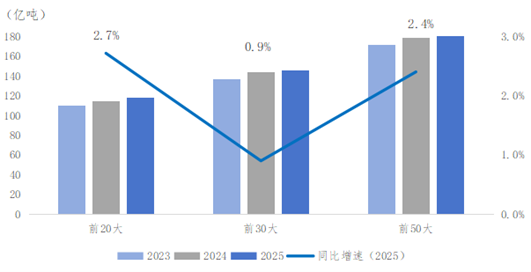 中国港口韧性增长引领全球。在前50大货物吞吐量港口排名中,中国以30个席位的绝对优势稳居首位,宁波舟山港以4%的增速蝉联全球第一,年吞吐量高达14.3亿吨,进一步彰显中国在全球海运体系中的核心承载地位。分区域看,长三角港口群向“智”提质,上海港洋山四期岸桥装卸效率提升5.4%。环渤海港口绿色转型提速,黄骅港(增速3.5%)建成全球首个全流程智能干散货码头并入选煤炭零碳试点,日照港(增速3.5%)借力新能源产业链货运需求对冲钢铁板块的调整压力。珠三角港口依托创新业态激发新动能,深圳港升级国际中转集拼与整船换装业务,吞吐量上涨5.1%。西南沿海通道红利释放,北部湾港依托西部陆海新通道的辐射作用,已成为衔接东盟腹地与内陆纵深的重要战略支点。