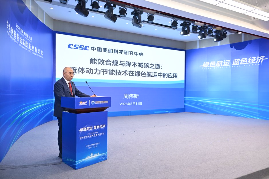近日,由山东海运股份有限公司主办的2026青岛国际航运周·绿色智能航运高质量发展大会在青岛举办。中船七〇二所党委书记周伟新出席并作大会主题报告。本次大会以"绿色航运 蓝色经济"为主题,汇聚了国际海事组织代表、国内外知名货主、船东、造船企业,以及金融、保险、船级社、船旗国机构、高校、科研院所、行业智库和新闻媒体等200余名嘉宾,共同探讨全球航运业绿色智能转型新趋势与高质量发展新路径。
