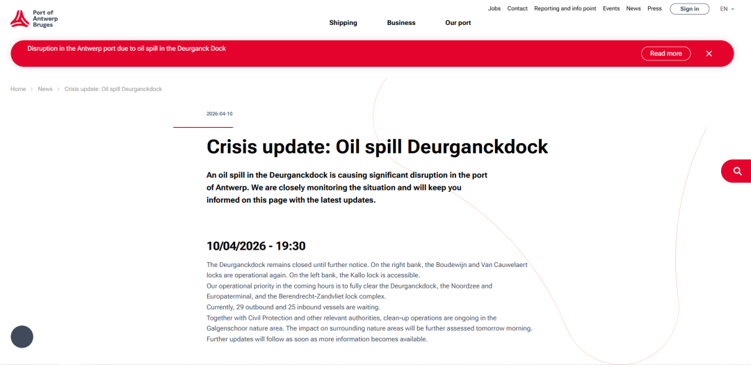 安特卫普-布鲁日港Deurganckdock突发严重漏油事故。4月10日,欧洲重要门户港——安特卫普-布鲁日港(Port of Antwerp-Bruges)一艘船舶在加油作业期间发生严重漏油,污染随后从Deurganckdock扩散至斯海尔德河(Scheldt),并迅速演变为一场影响航道、船闸、集装箱码头作业以及周边自然区域的港口危机。安特卫普-布鲁日港在官方页面中直接以“Crisis update”发布连续通报,并明确表示,此次漏油事故正在对港口运行造成“significant disruption”。从公开信息看,这并非一次普通的港内污染事件,而是一场已经波及港口核心功能区和主通航水域的重大运行事故。一次加油作业,演变成港口级危机