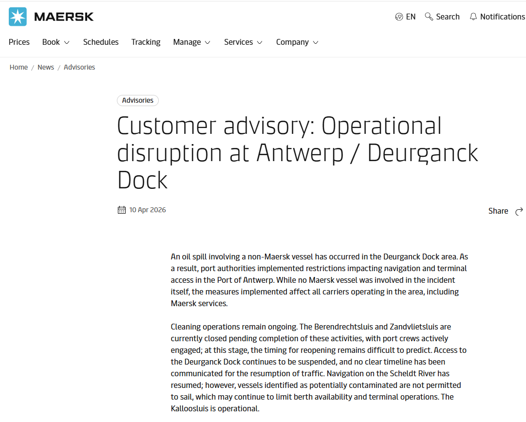 根据安特卫普-布鲁日港4月10日19:30(北京时间2026年4月11日 凌晨 01:30)的更新信息,当时已有29艘出港船和25艘进港船处于等待状态。更早前,部分媒体援引港方和地方船代消息称,受影响船舶包括21艘出港海船、24艘进港海船以及3艘需要移泊的海船。虽然不同时间点的统计数据有所差异,但这本身也反映出事故处置过程中,港口拥堵和等待规模一直在动态变化。可以确定的是,事故已经对船舶进出港秩序和码头作业计划造成明显冲击。对于班轮公司而言,这类事件的影响通常不会止于事故当天。马士基在客户通告中明确表示,虽然涉事船并非马士基船舶,但港方实施的限制措施已经影响到包括马士基在内的承运人。马士基还指出,Deurganck Dock的进入权限仍受限制,锁闸、泊位和终端准入都受到影响,预计安特卫普及Deurganck Dock挂靠将持续出现延误,甚至不排除个别船舶跳港的可能。换句话说,即便主航道重新开放,后续数日内的泊位安排、船期恢复、货物流转和内陆衔接,仍可能持续承压。环境影响同样不容忽视