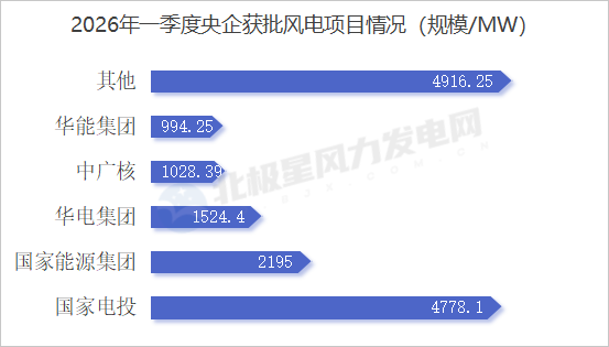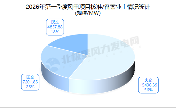 2026年一季度我国获核准/备案陆上集中式风电项目105个,总规模17706.84MW,约占据年度核准总量的64%,是我国风电产业增长的核心支撑。海上风电项目17个,总规模6615.8MW。2026开年以来,我国海上风电项目规划进程加快。分散式风电项目54个,总规模1673.48MW。分散式风电以就近开发、就近消纳为特点,成为县域新能源发展的重要补充,多地项目有序核准落地。大代小项目9个,总规模1217.5MW。“以大代小”升级改造项目审批落地提速,老旧风场提质增效进程持续加快。一体化项目4个,总规模262.5MW。风光储等一体化项目同步获批,推动我国风电向综合利用、高效协同方向升级。除此之外,2026年一季度获批的项目里,单体规模超500MW(不含海上风电)的共6个,总规模5450MW。其中包括民勤双茨科200万千瓦风电大基地项目以及吉林能发通榆100万千瓦风电项目等,切实响应国家“十五五”规划针对我国风光大基地、沙戈荒新能源基地规划方针。2026年一季度我国获批陆上集中式风电项目仍集中在资源较好的三北地区,依托优质风能资源,持续打造大型陆上风电基地。海上风电则集中在江苏地区,浙江涉及多个海上风电项目核准变更/延期,沿海省份海上风电开发管理更趋规范。分散式风电项目集中在重庆、辽宁等地,依托当地县域能源消纳需求与分布式能源发展规划,实现就近开发、就地消纳的本土化布局。2026年第一季度,央企仍是风电项目获批主力。在 “绿电直连” 政策深入推动下,全国多地加快企业“自发自用”型风电项目核准与建设,民企获批规模进一步扩大,推动风电电力就近消纳、直供终端用户,进一步提升新能源利用效率。本次统计的风电项目核准/备案数据显示,在央企业主中,国家电投获批容量位居首位,达4778.1MW;国家能源集团位列第二,获批规模2195MW;华电集团排名第三,获批规模1524.4MW。2026年一季度我国风电项目核准呈现基地化推进、海陆协同、央企主导、政策赋能的鲜明特点,项目布局贴合国家能源战略,产业高质量发展态势明确,为全年风电产业增长奠定良好基础。来源:北极星风力发电网