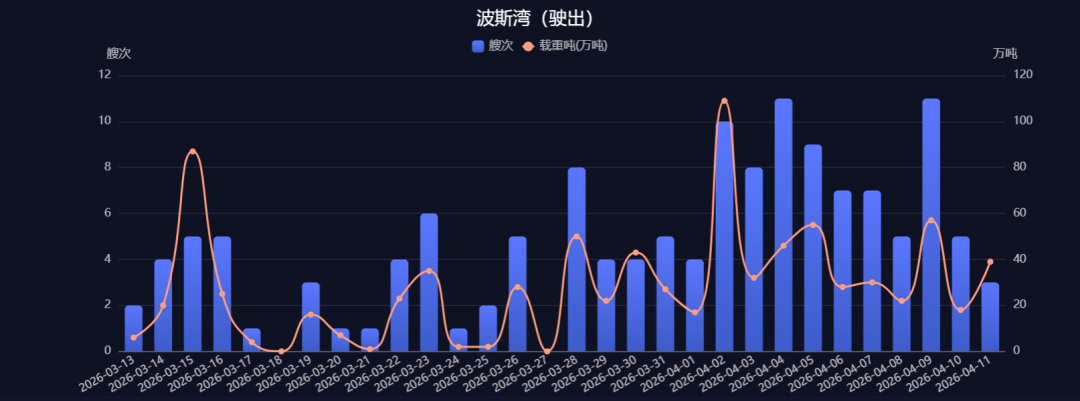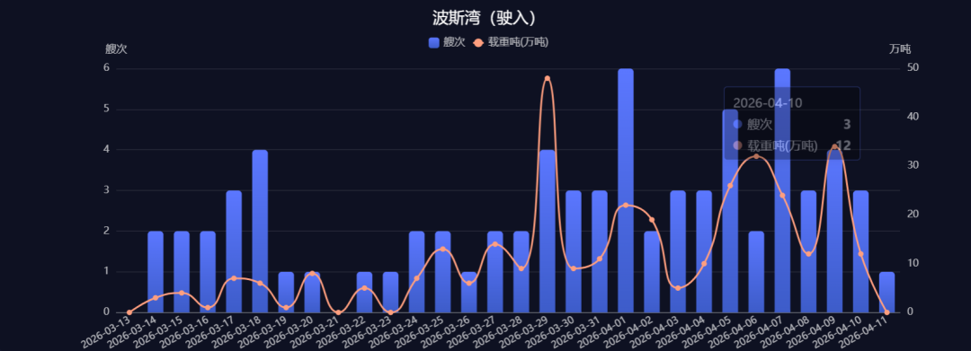 不过,从整体通行数据来看,复航进程依然缓慢。船视宝数据显示,4月10日波斯湾船舶通行总量仅为8艘次,其中集装箱船2艘次、LPG船1艘次,其余为其他类型船舶,原油船、成品油船及LNG船均未出现通行记录;当日驶入3艘次、驶出5艘次。