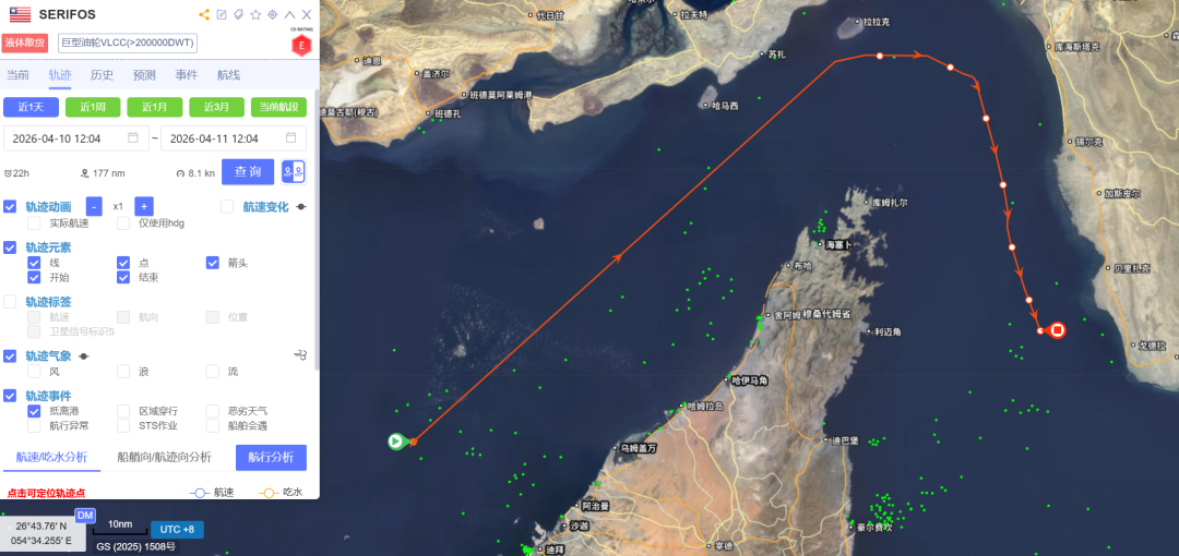 中远海科旗下船视宝为《海运圈聚焦》提供的AIS数据显示,“SERIFOS”轮早在3月1日即通过霍尔木兹海峡进入波斯湾水域,并于3月6日抵达沙特朱阿马港(Juaymah)完成装货。此后,该轮在波斯湾内长时间等待,直至4月11日5时才启程驶出霍尔木兹海峡,目前航向显示为马来西亚丹戎布鲁亚斯港。