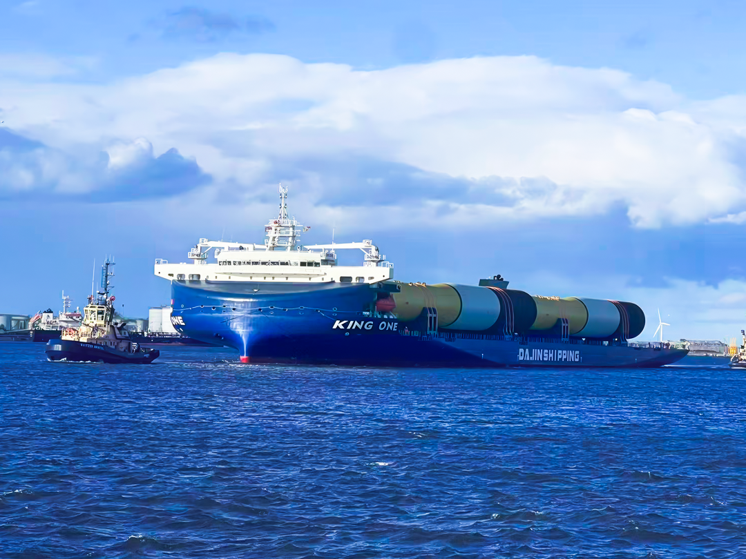 据大金重工消息,2026年4月6日,大金重工股份有限公司首制4万吨甲板运输船KING ONE轮跨越近12000海里,从中国蓬莱港顺利抵达英国蒂斯港,圆满完成首航征程。本次运输搭载8根直径10米、单重超1200吨的超大型海上风电单桩。