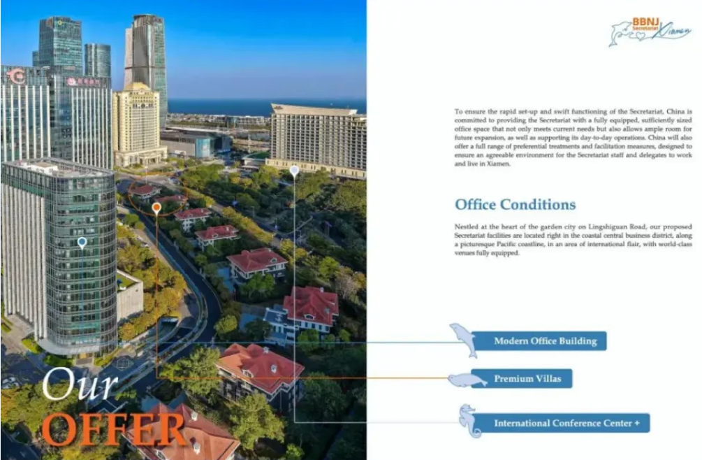其次,中方承诺提供一栋15层、总面积1.2万平方米的现代化办公大楼,位于厦门市中心领事馆路滨海CBD,并配套两栋高品质生活与多功能建筑;厦门已入驻40多个国际组织或分支机构,包括联合国开发计划署、教科文组织、IUCN、WWF等,拥有6万名雇员,1/3居民为外籍人士,国际化氛围浓厚。