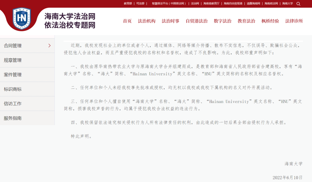 大连海事大学其《章程》第二条规定:“学校名称为大连海事大学,简称‘大连海大’、‘海大’,英文校名为Dalian Maritime University,缩写为DMU。”,该校自1953年建校以来,长期以“海大”作为非正式简称,在校内及航海教育领域广泛使用。只是,这与海南大学的《严正声明》相悖。考虑到中国目前没有统一的高校简称注册或保护制度,高校简称多基于历史习惯、地域认知和内部使用形成,不具有法定排他性。因此,即使两校均称“海大”,也不构成法律冲突。实际上,在本地或行业语境中(如大连本地、航海系统),人们通常理解“海大”指大连海事大学;而在海南或全国性官方场合,“海大”更可能指向海南大学,尤其自其2025年正式声明后。