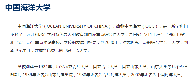 中国海洋大学,在学校官网、官方文件及权威媒体中,“中国海大”是其标准简称,对应的英文缩写为OUC(Ocean University of China),确实没有两个字的“海大”霸气,之所以选择4个字的简称,或许也是因为“海大”这个简称太多了。只是在日常交流、校园文化及部分非正式场合,“海大”也常被用作简称,尤其在青岛本地或高校圈内。