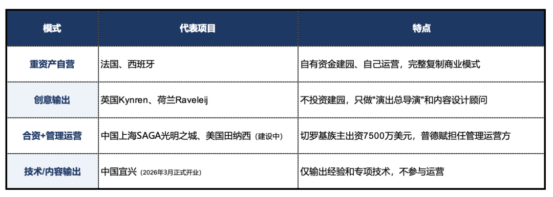 普德赋出海扩张的模式也非常清晰,法国和西班牙项目的重资产自营模式,英国、荷兰的创意输出模式,美国田纳西的合资运营管理模式,以及宜兴的技术输出模式,只是上海的SAGA光明之城原计划是合资+运营管理模式,后无奈几乎变成重资产自营模式,其经营结果也是始料未及。