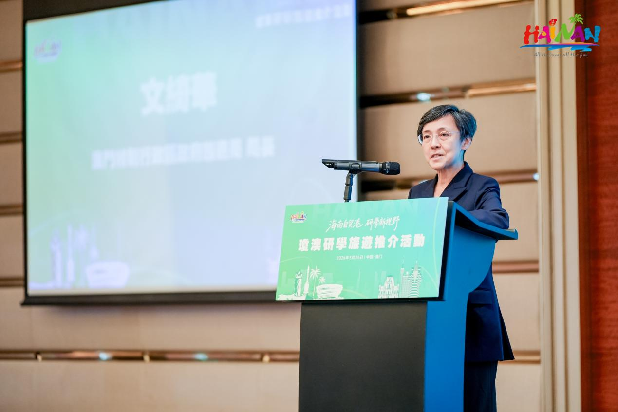3月26日,由海南省旅游和文化广电体育厅主办的“海南自贸港 研学新视野”琼澳研学旅游推介活动在澳门举行。澳门特别行政区政府旅游局局长文绮华出席并致辞。澳门旅游业议会会长胡景光、世界旅游经济研究中心行政总监王硕以及涉旅企业、澳门学校等约80位嘉宾参加活动。