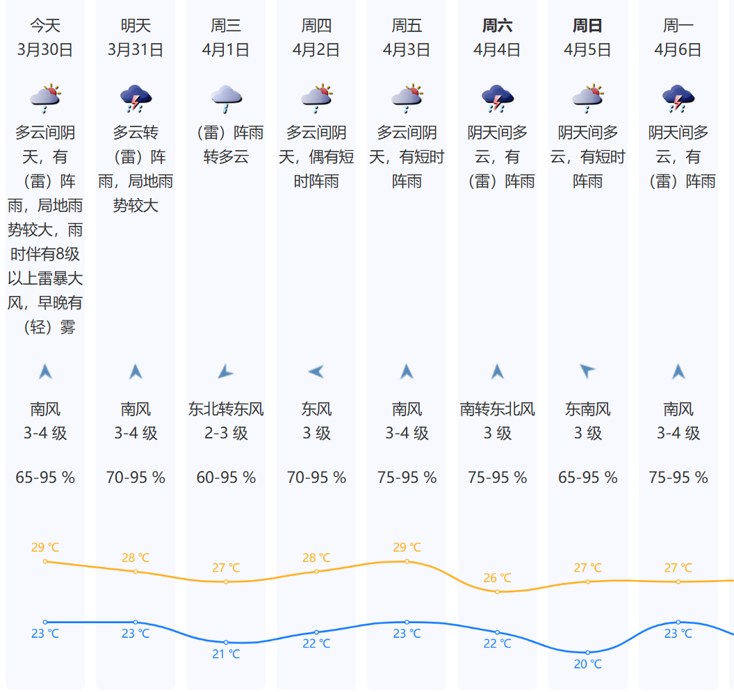 预计3月31日-4月1日有一次雷雨天气过程,局地雨势较大,并伴有短时大风,气温小幅下降;
