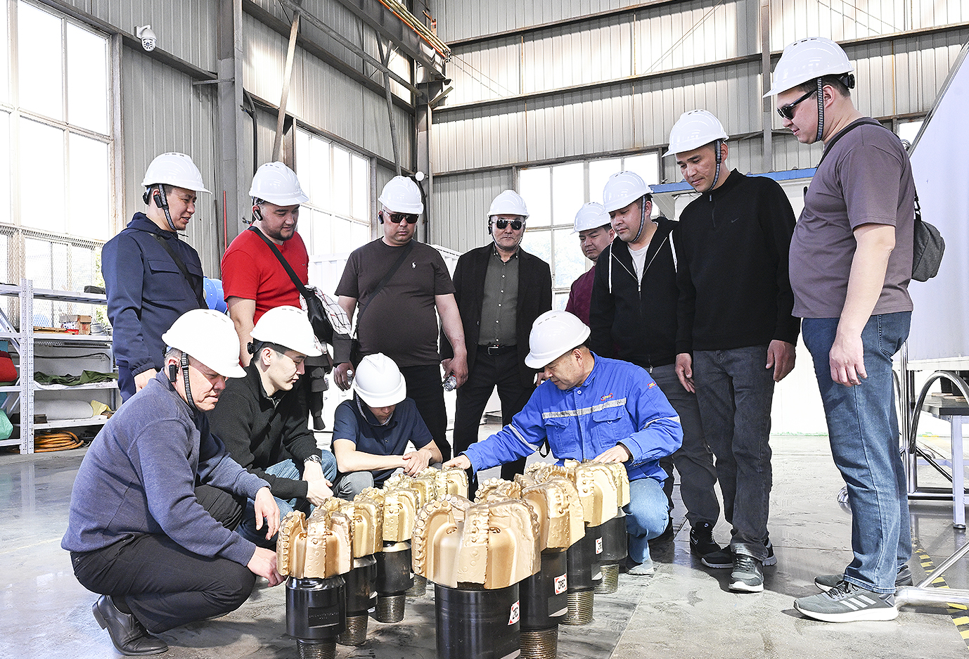在PDC钻头车间,多样的钻头产品型号、精细的制造工艺给学员们留下印象深刻。钻头项目部负责人于振忠结合哈萨克斯坦坚戈油田、岸边油田的钻井实际,从PDC钻头耐磨特性、适配性等维度,讲解产品技术创新点与现场应用优势,让学员直观感受到中曼装备的细节品质与技术实力。在铠撒工具车间,学员们现场了解了纯电动坐封工具、打捞工具、打孔工具等高端仪器,对中曼铠撒技术在陆地、海洋等极端工况下的表现由衷称赞。