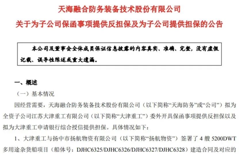 4月10日,天海防务发布公告称,将为全资子公司江苏大津重工有限公司提供合计不超过2130万美元的反担保,用于大津重工与扬中市扬航物资有限公司签署4艘5200DWT多用途杂货船项目。4艘新船计划于2027年9月至12月交付。
