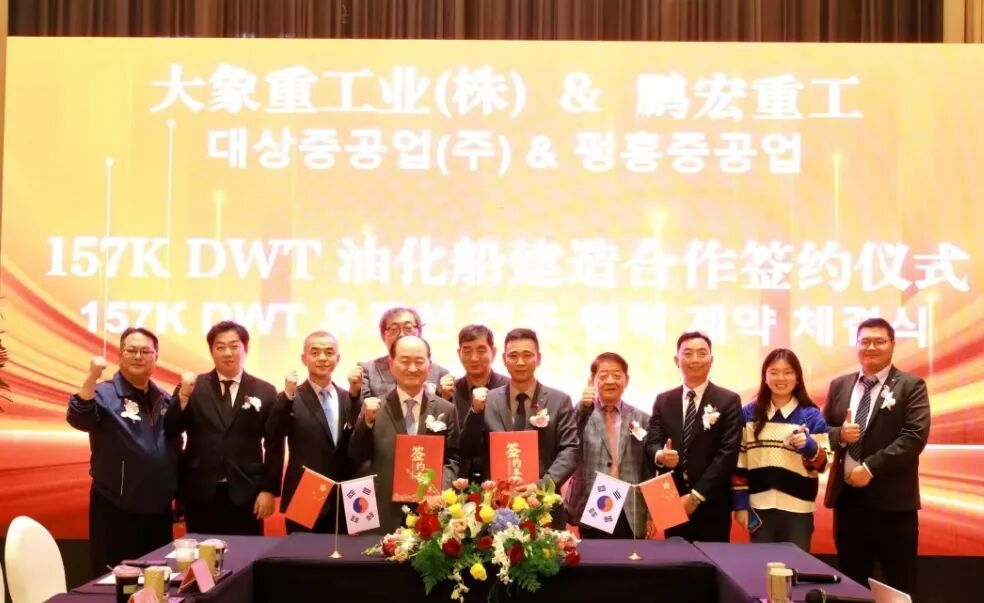 近日,总部位于韩国的大象重工与宁波鹏宏船舶重工有限公司举行4+2艘15.7万DWT油化船建造合作签约仪式。据悉,宁波鹏宏船舶重工有限公司成立于2025年2月,是一家以建造主流船型和中小型特种作业船舶为主的造船企业。
