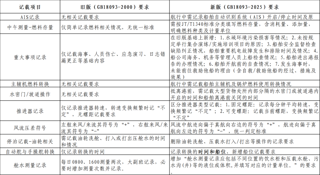 重大事项记录:新增“水域环境污染损害等情况”“未按规定举行集合演练或实施培训项目记述其原因”“船舶安全监督检查缺陷纠正情况,船舶重要机电故障发生和排除时间及情况”“船公司海务、机务等管理人员上船检查情况”“船舶进出港报告的办理”“船舶开航前的自查情况”“发生海事的情况,自救或救助他船的经过、措施及效果,未能前往救助他船的理由”等内容。