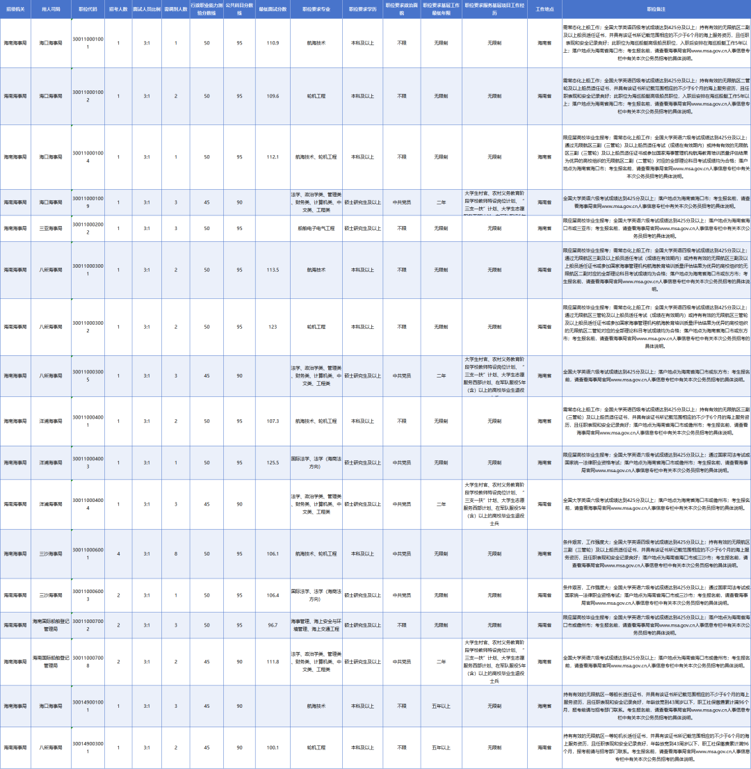 2026年度,海南局计划面向社会招录39个职位50名公务员,招录专业覆盖航海技术、轮机工程、海事管理、船舶与海洋工程、海商法、法学、英语、环境工程等多个领域。