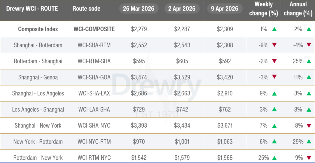 截至4月9日,Drewry世界集装箱运价指数(WCI)上涨1%至2309美元/FEU。
