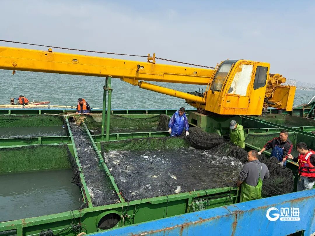 4月10日上午,一艘从福建驶来的活鱼运输船顺利抵达鲁海丰国家级海洋牧场。船上搭载着从福建采购的鲈鱼、包公鱼、真鲷等优质苗种共计10万尾,目前已陆续投放至牧场深水抗风浪网箱开展生态养殖。这是青岛市今年首批“南鱼北养”鱼苗。