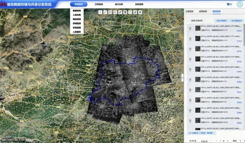 目前平台已完成雄安新区PIESAT-1和PIESAT-2 SAR卫星数据的采集、处理、入库管理及方案配置工作,实现了SAR卫星数据的便捷查询与下载,同时,基于地类提取大模型,通过正射校正、影像融合、匀光匀色、镶嵌裁剪等,成功提取雄安新区全域的耕地、林地、草地、建筑的地物信息,形成分辨率优于1米的GF2镶嵌成果图,并完成系统入库及不同地物选择的卷帘式分析。