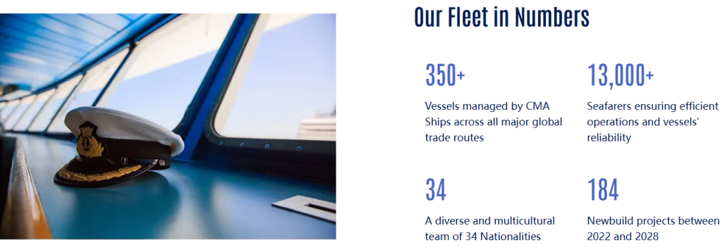 CMA SHIPS是达飞集团(CMA CGM Group)的重要子公司,成立于2008年1月1日。如今管理和运营着一支高性能、多样化的船队,拥有超过350艘船舶。作为集团的核心力量,CMA SHIPS以安全、创新和可持续发展为驱动力,并致力于激励新一代海员。
