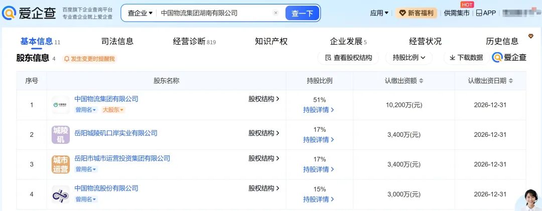 新成立的中国物流集团湖南有限公司,由中国物流集团及旗下核心企业中国物流股份,与岳阳市城市运营投资集团有限公司(简称岳阳城运)、岳阳城陵矶口岸实业有限公司(简称岳阳口岸)等市属国资平台共同出资。新公司股权信息显示,中国物流集团、岳阳城运、岳阳口岸、中国物流股份,分别持股51%、17%、17%、15%。