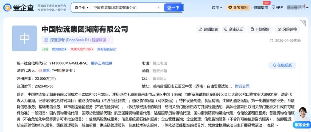 爱企查信息显示,新公司注册时间为3月30日,注册资本2亿元,注册地位于湖南省岳阳市云溪区中国(湖南)自由贸易试验区岳阳片区,董旭担任董事长、总经理。据了解,董旭同时担任中国物流股份有限公司(简称中国物流股份)董事长。