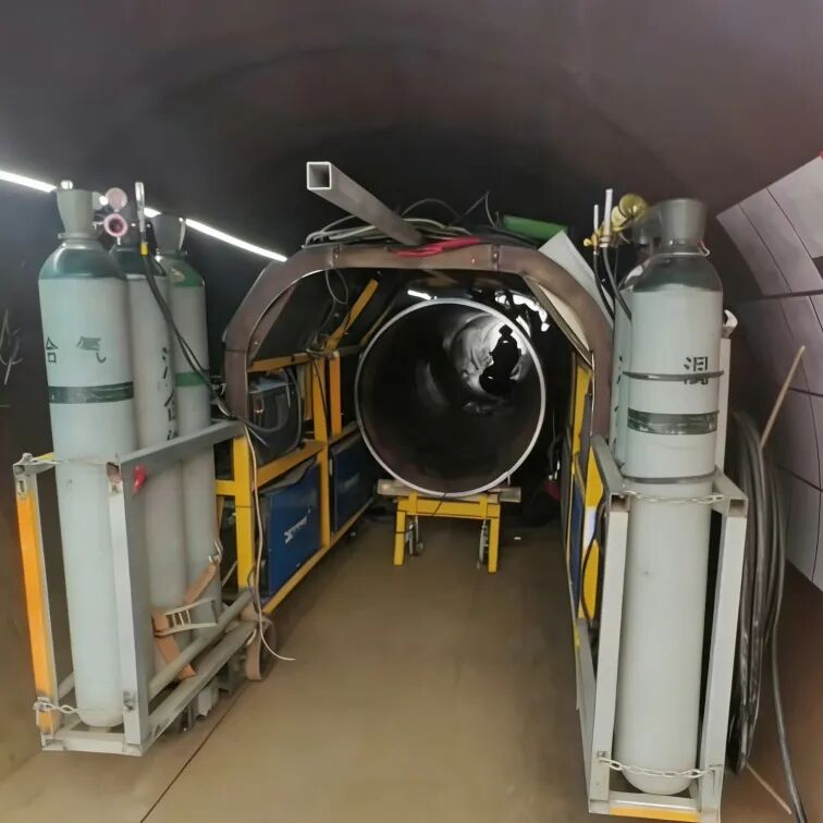 除了外部环境复杂,在3.08米内径的隧道里,焊接1219毫米管径的管道,堪称“螺蛳壳里做道场”,空间的局限让每一步操作都格外艰难。更具挑战的是,隧道采用2500米曲率半径的曲线布置,常规的“竖井焊接+管道回拖”工艺,极有可能让管道在拖拉过程中撞墙、小车脱轨,后果不堪设想。