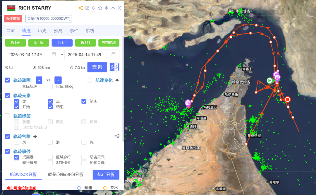 在这一批船舶中,“RICH STARRY”轮的航行路径尤具风向标意义。自封锁措施生效以来,该船成为首艘完成“进入波斯湾——再度驶离”的完整航程船舶。AIS轨迹显示,其于4月4日通过霍尔木兹海峡进入湾内,并在迪拜以南水域抛锚停留,直至4月13日重启航程,于4月14日8时成功驶离海峡。这一过程在一定程度上验证了当前通行环境虽趋紧,但尚未演变为实质性“封锁闭环”。