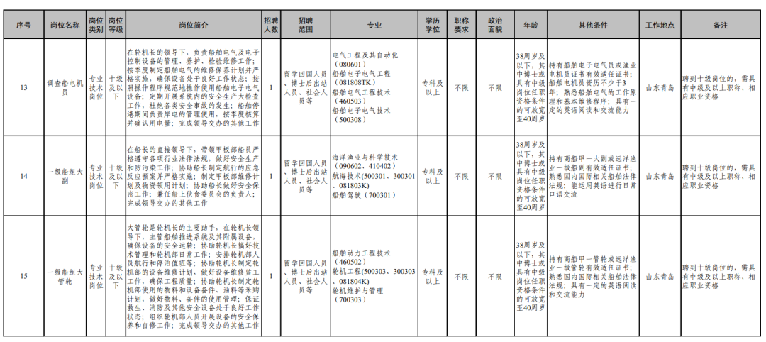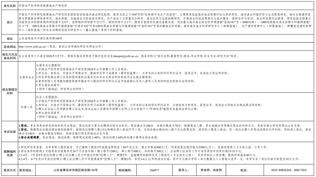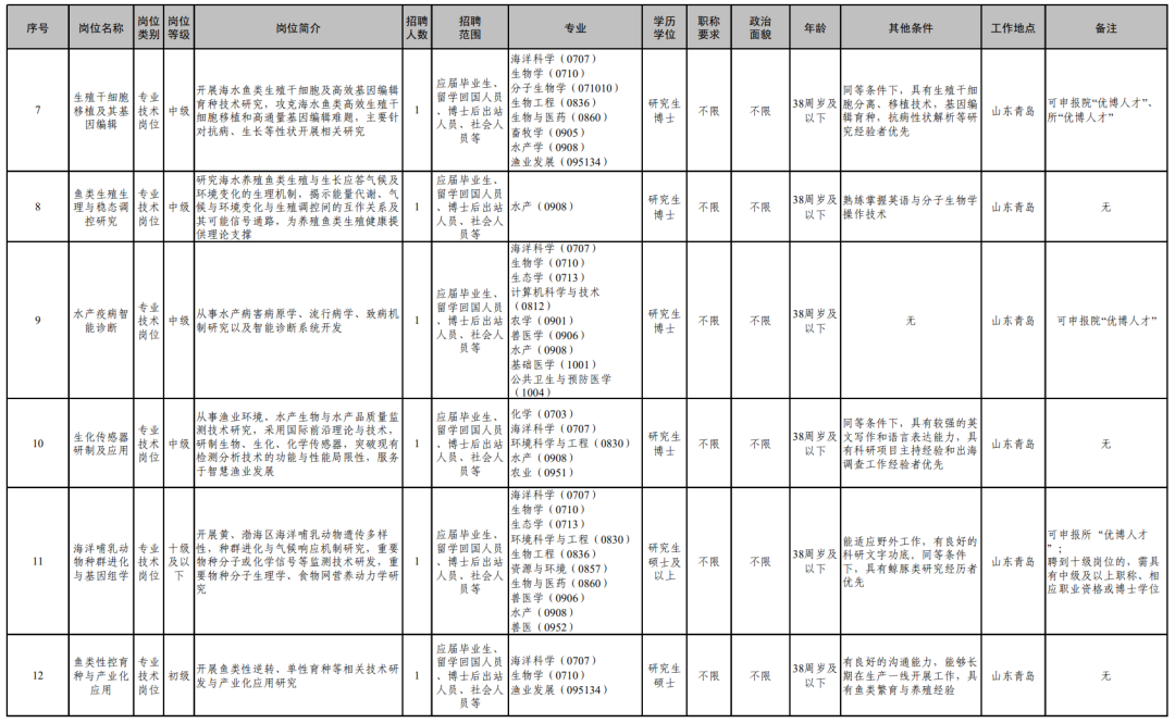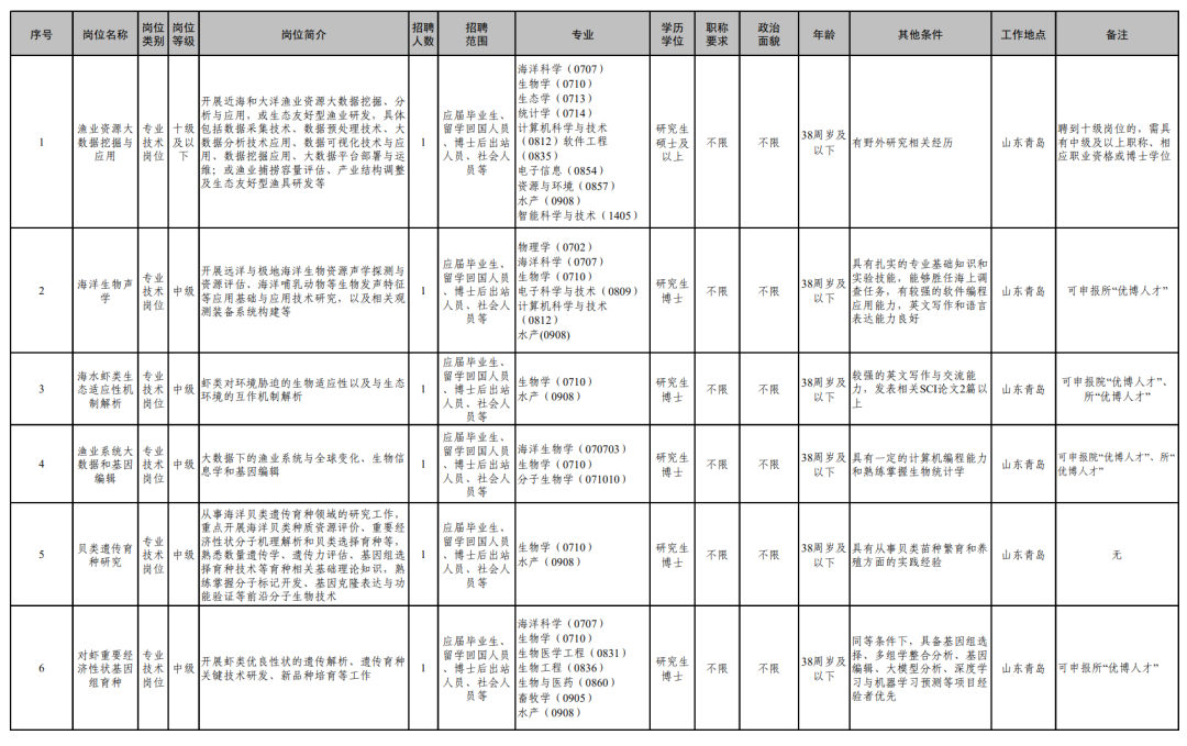 详见《中国水产科学研究院黄海水产研究所2026年度第二批统一公开招聘岗位信息表》(附件2)。