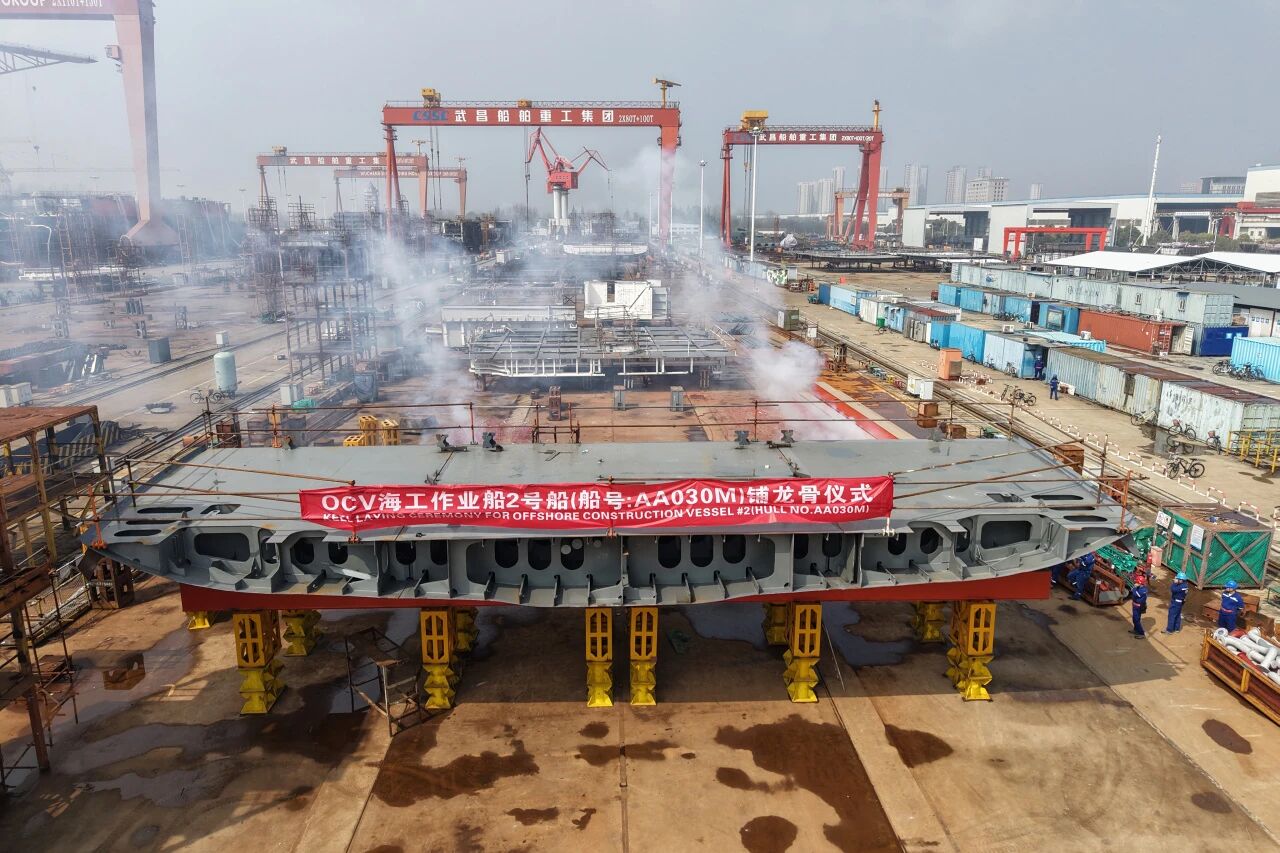 由武昌造船承建的海工作业船2号船顺利达成上船台节点,正式进入船台连续搭载阶段。