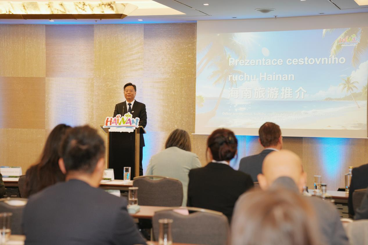 “阳光海南·度假天堂”海南旅游文化推广交流活动在捷克布拉格举行,图为省旅文厅厅长陈铁军进行海南旅游推介。