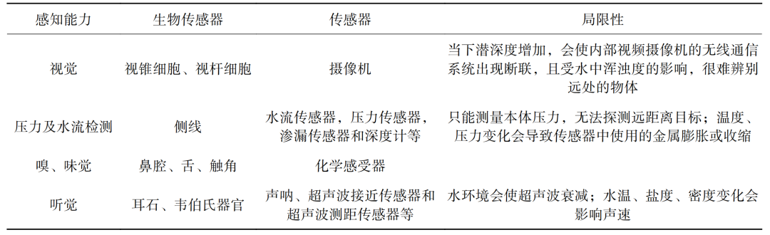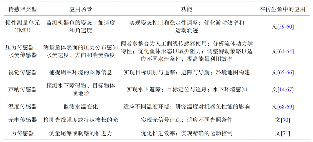 表3 不同传感器在仿生机器鱼上的应用及其功能