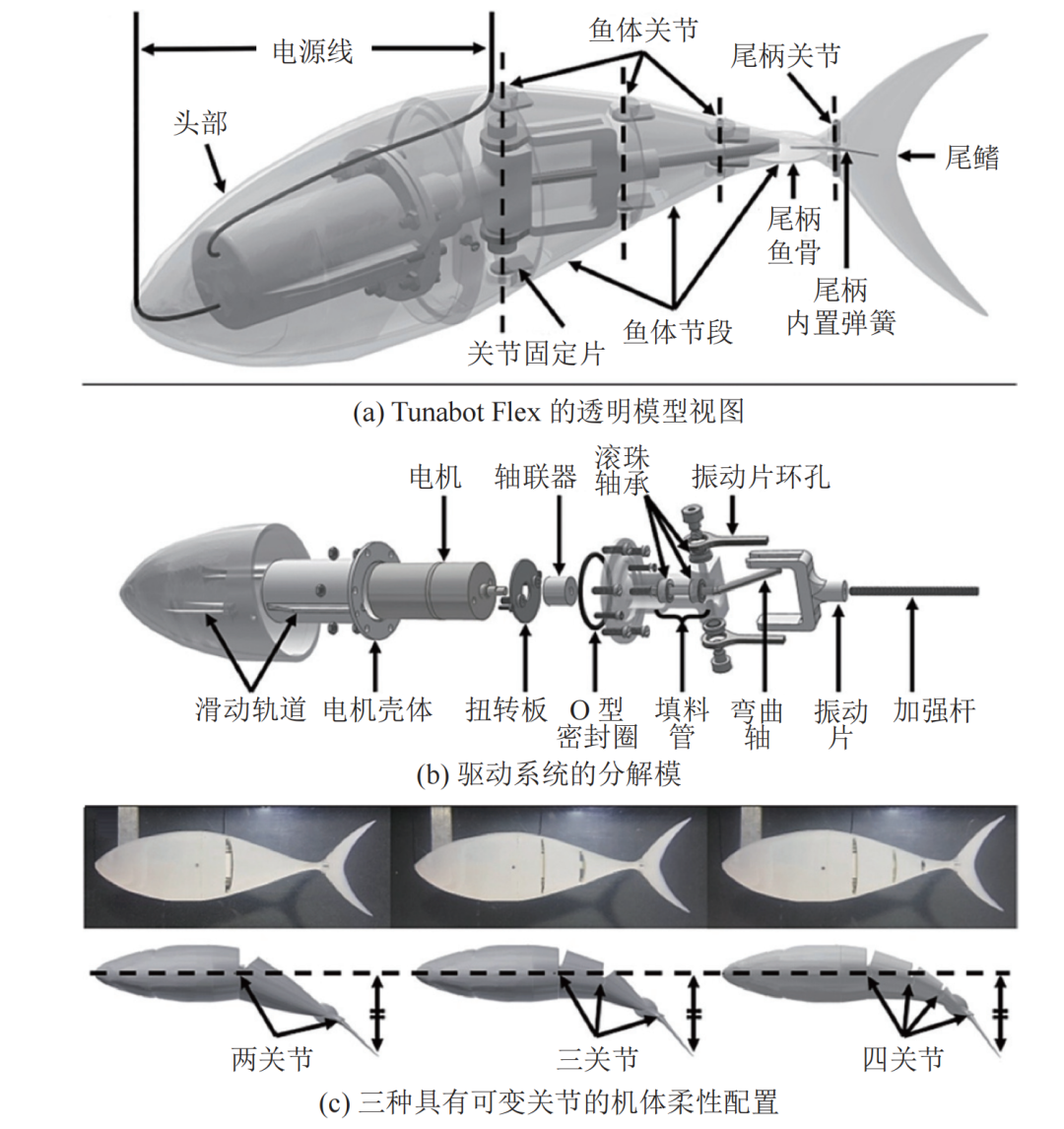 弗吉尼亚大学朱建忠团队提出Tuna Robotics项目,以黄鳍金枪鱼和大西洋鲭鱼为Tunabot(图3)外观设计的灵感来源。其设计只保留了由高刚度聚合物制成的尾鳍,体表附有弹性皮肤以最大限度地减少驱动过程中的屈曲;通过高频尾摆技术,其摆尾频率可达15Hz,最大游动速度约为4BL/s(1m/s)。