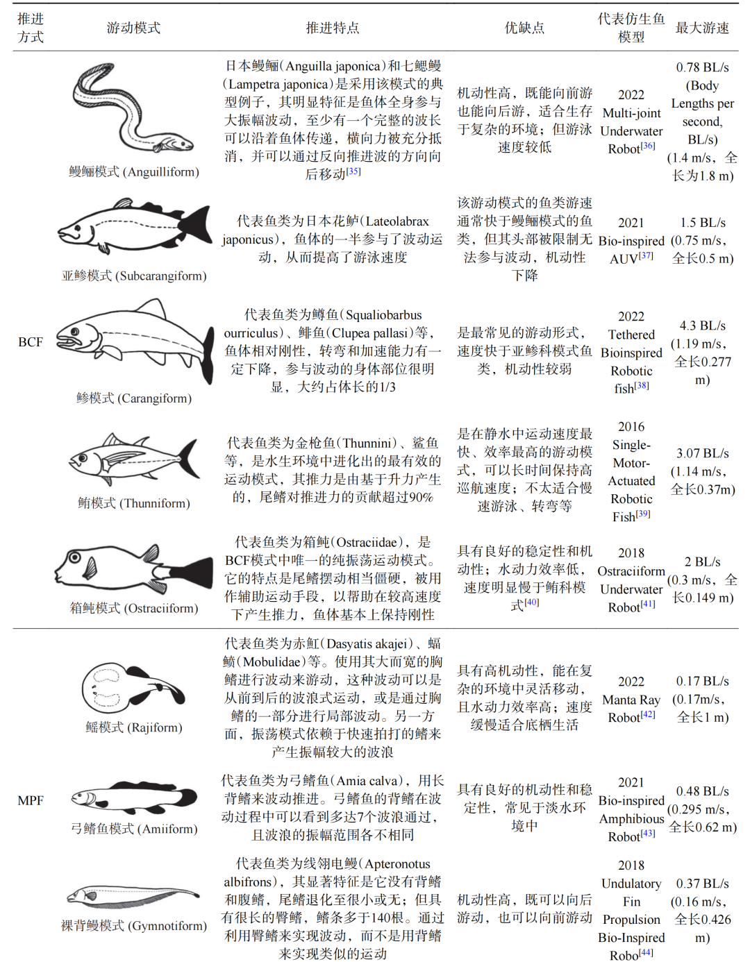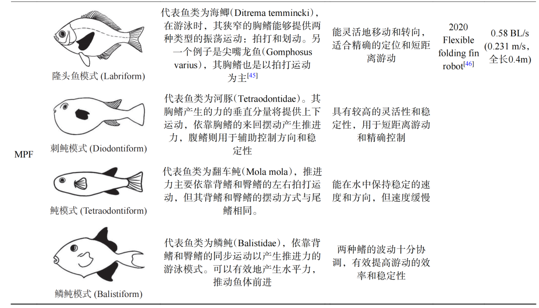 LINDSEY和WEBB基于鱼类游动时驱动部位的差异,将其推进方式划分为两大基本模式:身体/尾鳍推进模式(BCF)和中间鳍/偶鳍模式(MPF)。BCF和MPF模式又都可以分为两种运动类型:波动或振荡。此外,也可以根据推进部分的不同,划分为更细致的分类。BCF模式通过鱼体特定区段的波动与尾鳍的协调运动,与流体作用产生向后传播的推进波,可以进一步细分为5个游动模式:鳗鲡模式、亚鲹模式、鲹模式、鲔模式和箱鲀模式。MPF推进模式的鱼类则是通过身体中部的鳍来产生推力,可以细分为7个游动模式:鳐模式、刺鲀模式、弓鳍鱼模式、裸背鳗模式、鳞鲀模式、隆头鱼模式和鲀模式。鱼类不同游泳模式的详细分类及特征如表1所示。