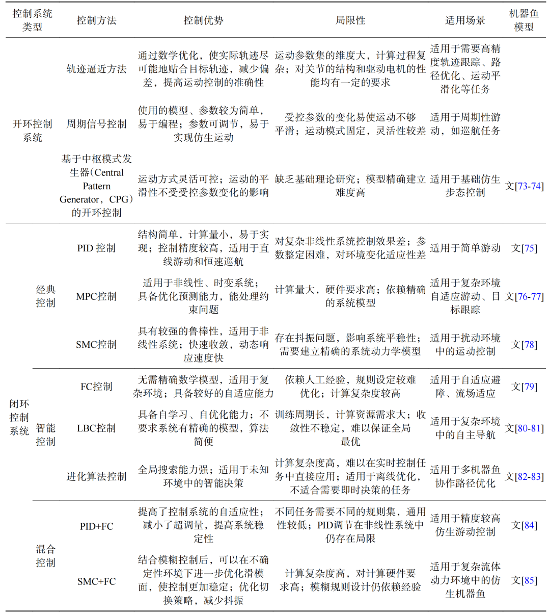 根据控制系统的反馈方式,仿生机器鱼的运动控制系统可分为开环控制系统和闭环控制系统。开环控制系统通常依赖预设的运动模式或周期信号,实现仿生游动的基本控制,具有计算量小、实现简单的优势,但缺乏对外部环境变化的自适应能力。闭环控制系统则通过实时反馈调整运动参数,提高系统的稳定性和环境适应性,包括比例-积分—微分控制(PID)、模型预测控制(MPC)和滑模控制(SMC)等经典控制方法,以及模糊控制(FC)、基于学习的控制(LBC)方法等智能控制方法。这两类控制系统在控制精度、实时性、环境适应性、计算复杂度等方面各具特点,因而针对不同应用场景具有不同的适用性,如表4所示。