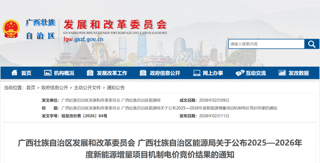 根据《广西壮族自治区发展和改革委员会 广西壮族自治区能源局关于印发〈广西壮族自治区深化新能源上网电价市场化改革实施方案〉的通知》(桂发改价费规〔2025〕916号)、《广西壮族自治区发展和改革委员会 广西壮族自治区能源局关于2025—2026年新能源增量项目机制电价竞价工作有关事项的通知》(桂发改价费〔2026〕52号),以及《广西壮族自治区新能源项目机制电价竞价实施细则(试行)》等要求,我区组织开展了2025—2026年度新能源增量项目机制电价竞价工作。现将竞价结果及有关事项通知如下: