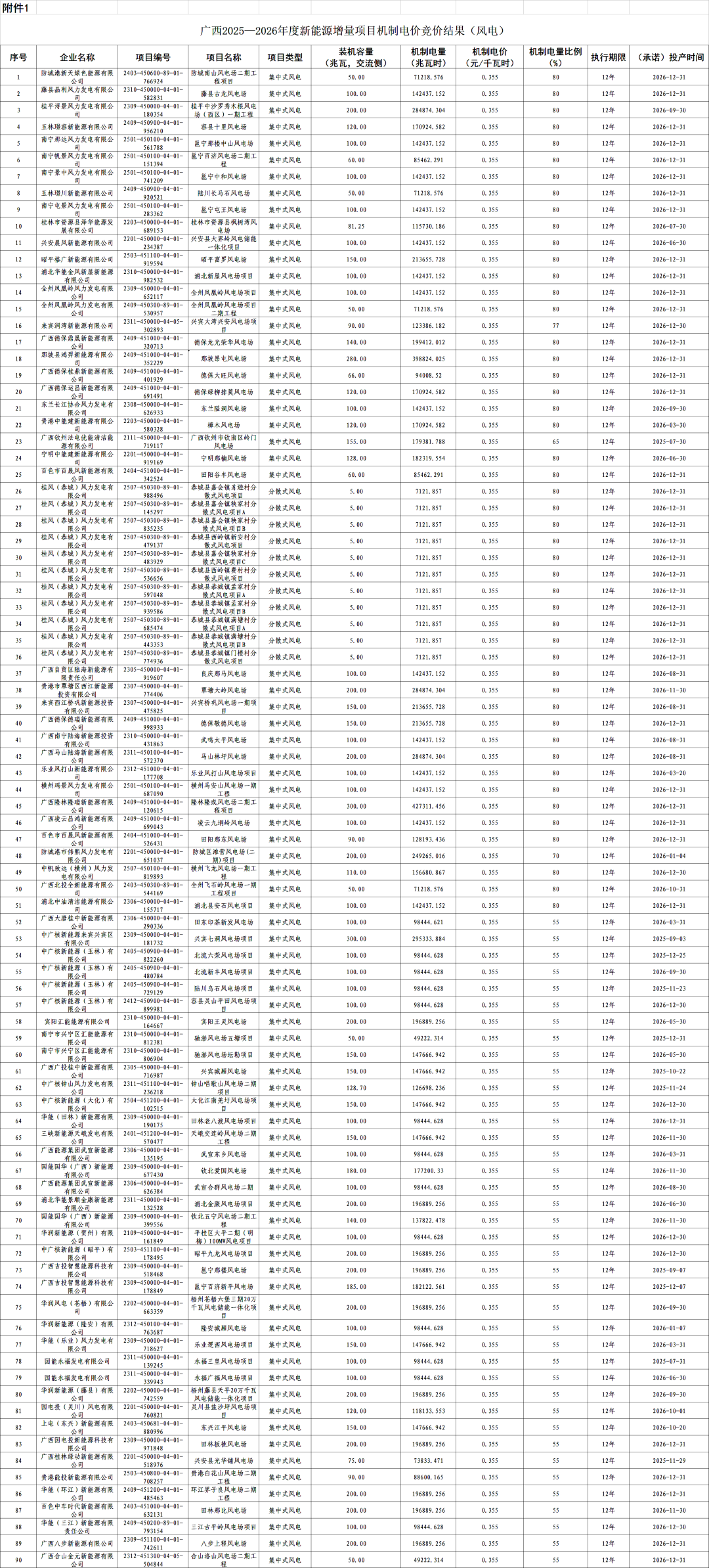 附件:1.广西2025—2026年度新能源增量项目机制电价竞价结果(风电)