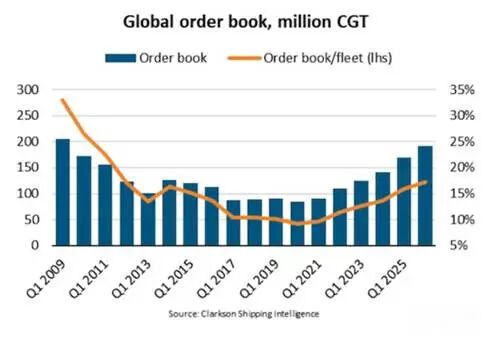 截至 2026 年第一季度末,全球手持订单量达 1.91 亿修正总吨(CGT),创下 17 年新高,相当于全球现有船队规模的 17%,为 2011 年以来的最高占比。